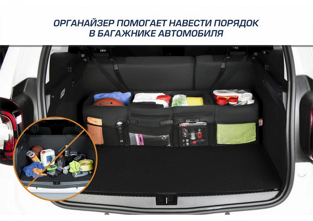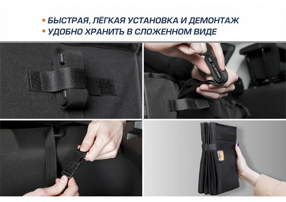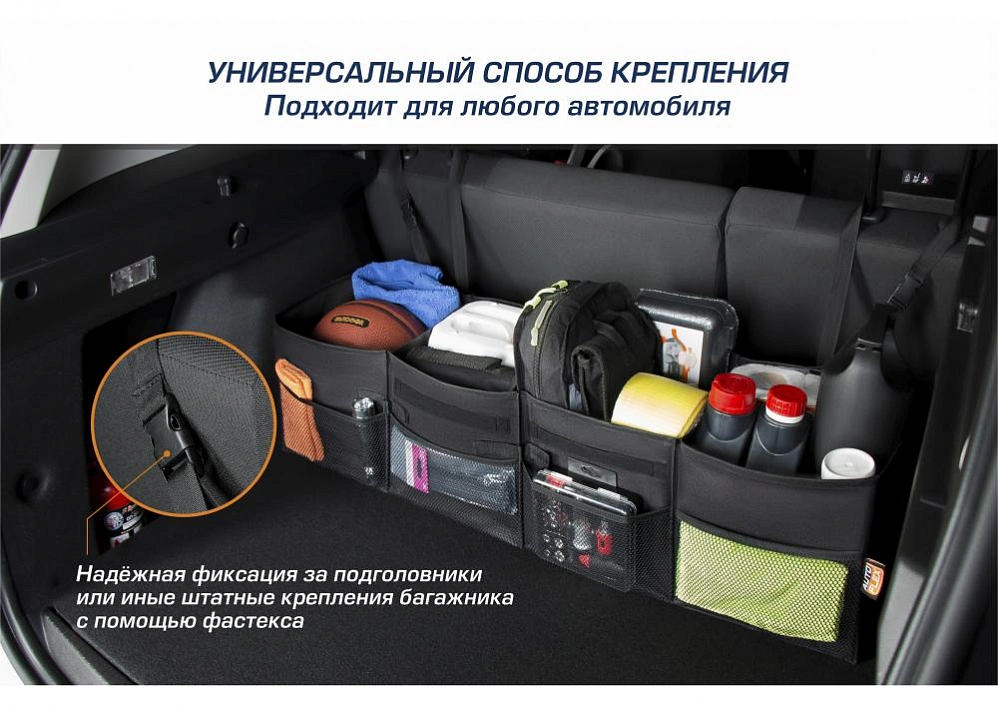 - Фиксация органайзера в багажнике происходит с помощью двух регулируемых строп, что исключает его произвольное перемещение по багажнику.