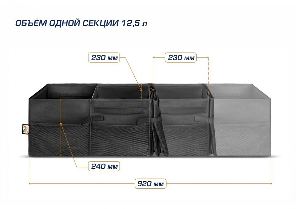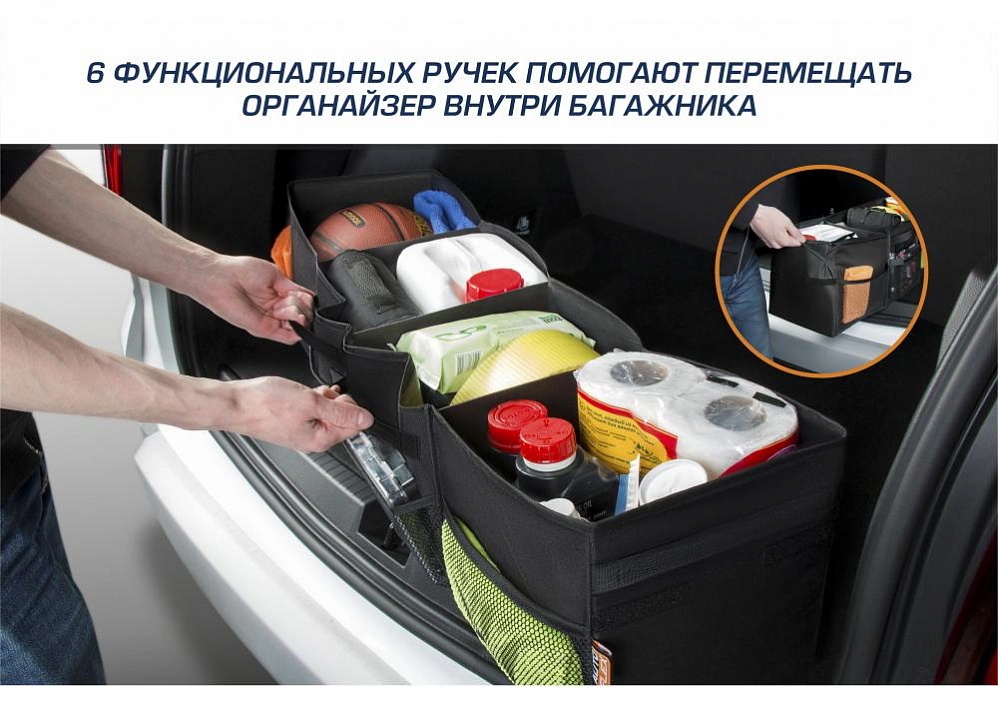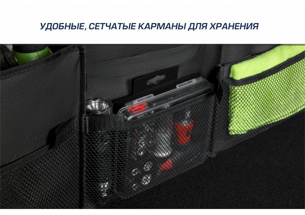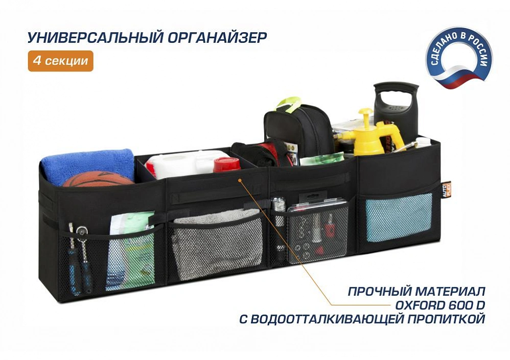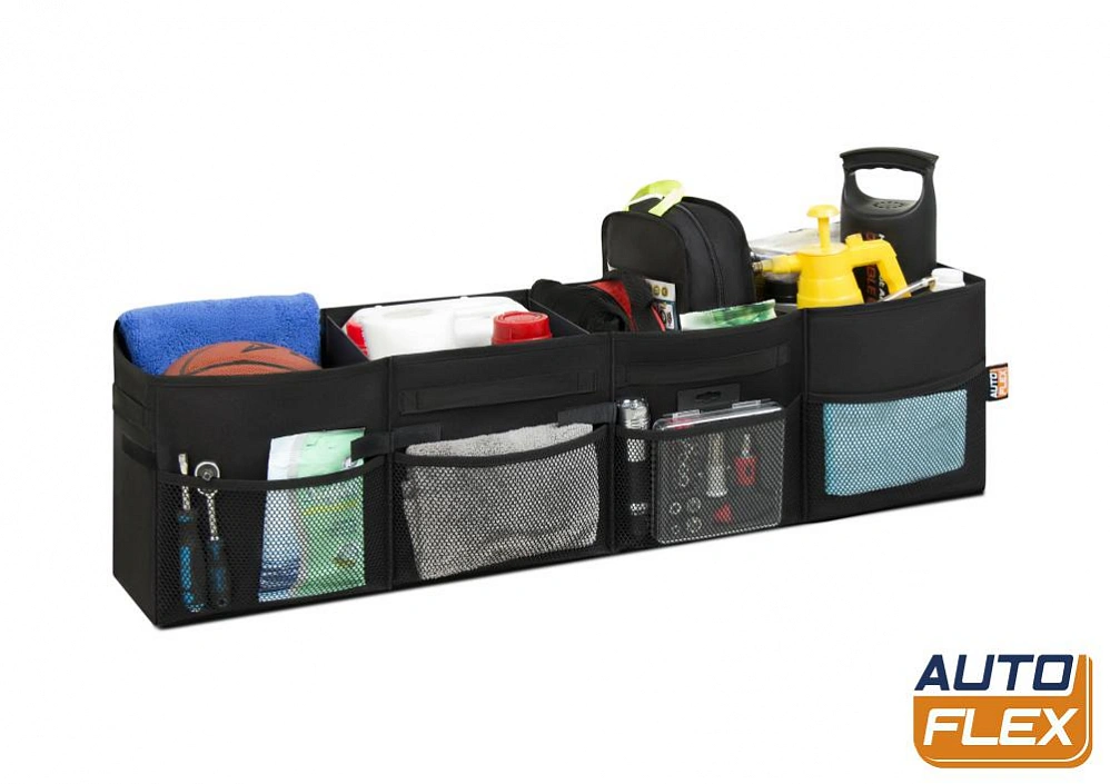 Органайзер AutoFlex предназначен для хранения вещей и автомобильных принадлежностей. Это удобный аксессуар, который поможет в поддержании порядка в багажнике вашего автомобиля. Органайзер разделен на 4 секции пластиковыми перегородками, которые фиксируют форму ячеек.